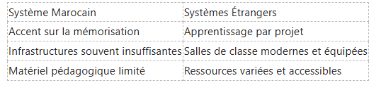 La qualité de l'enseignement au Maroc suscite des interrogations, surtout lorsqu'on la compare aux systèmes étrangers. En examinant les performances des étudiants marocains en lecture et en mathématiques, on constate que le pays se retrouve souvent derrière les normes internationales, comme le Programme international pour le suivi des acquis des élèves (PISA), qui place le Maroc à la traîne par rapport à des pays comme le Canada ou la Finlande. Ce dernier, réputé pour son approche pédagogique centrée sur l'étudiant, offre une éducation de qualité où la collaboration et la créativité sont au cœur des apprentissages.